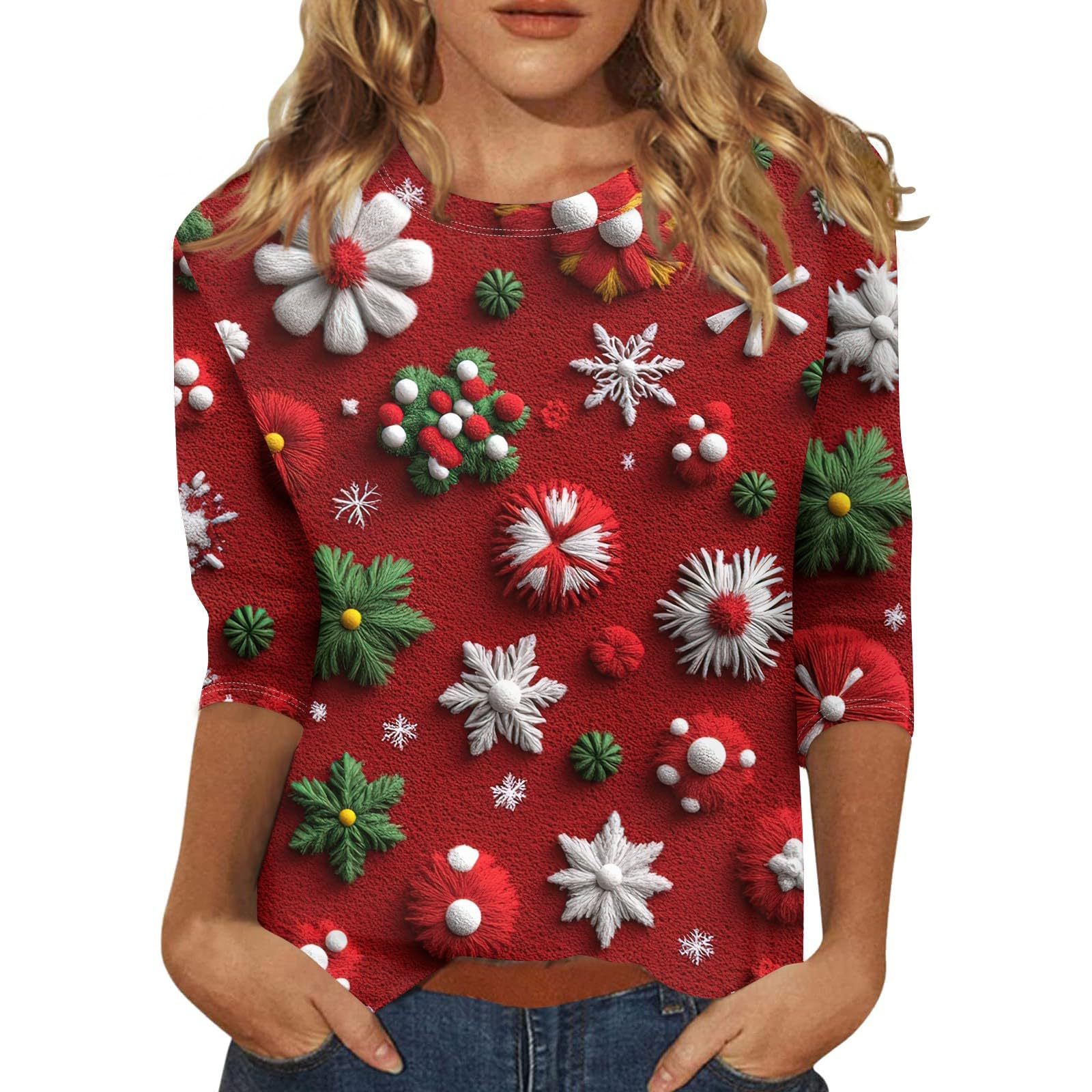 Women's Christmas Round Neck T-Shirt – Festive 3/4 Sleeve Holiday Top