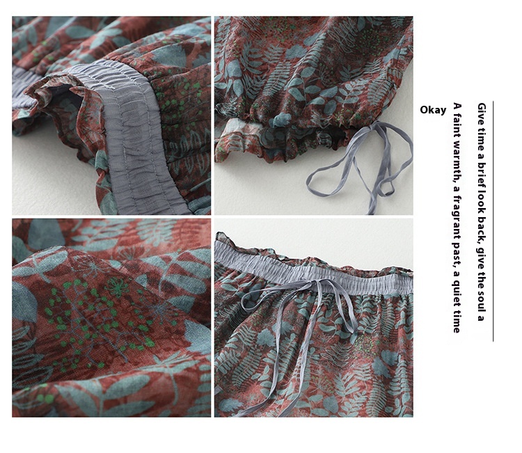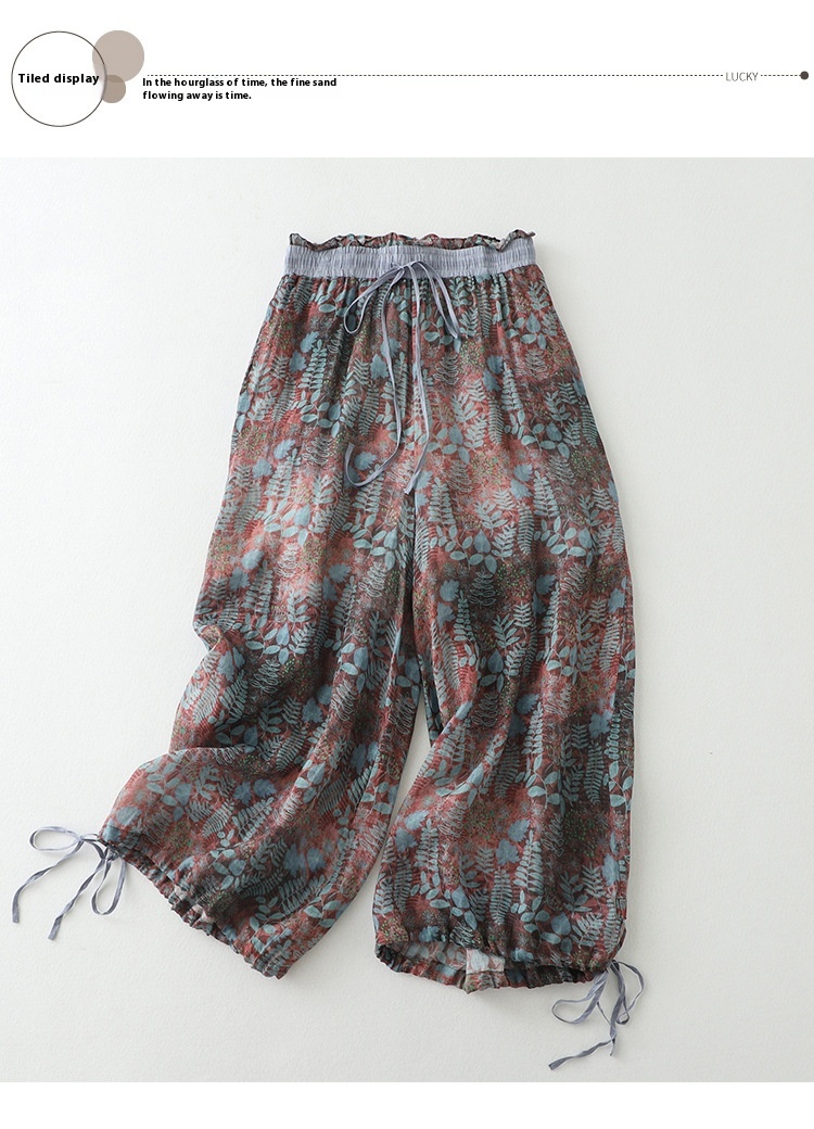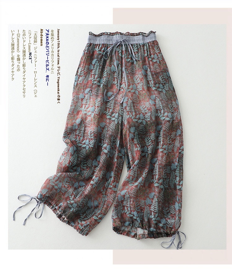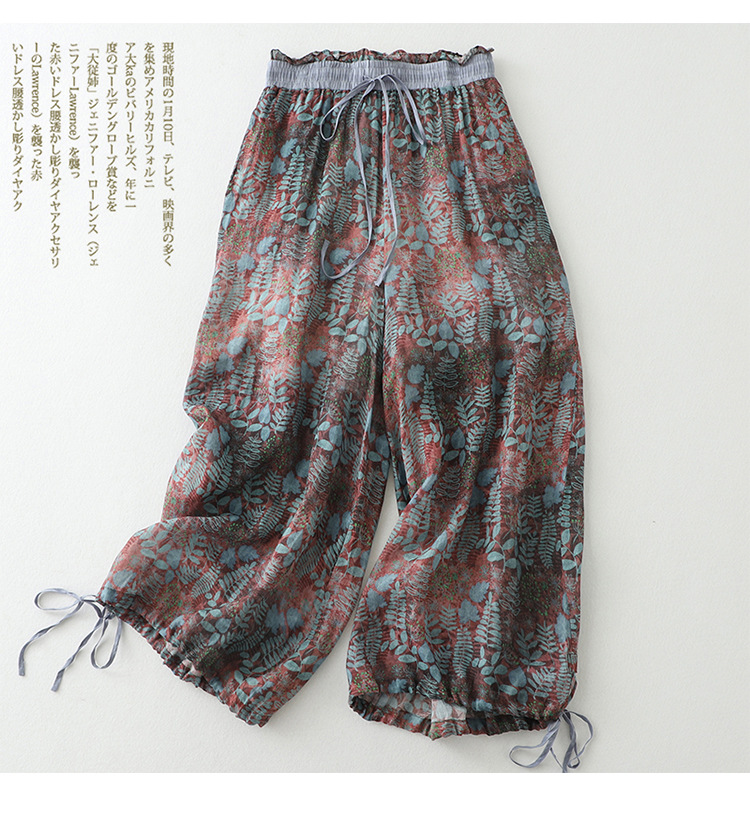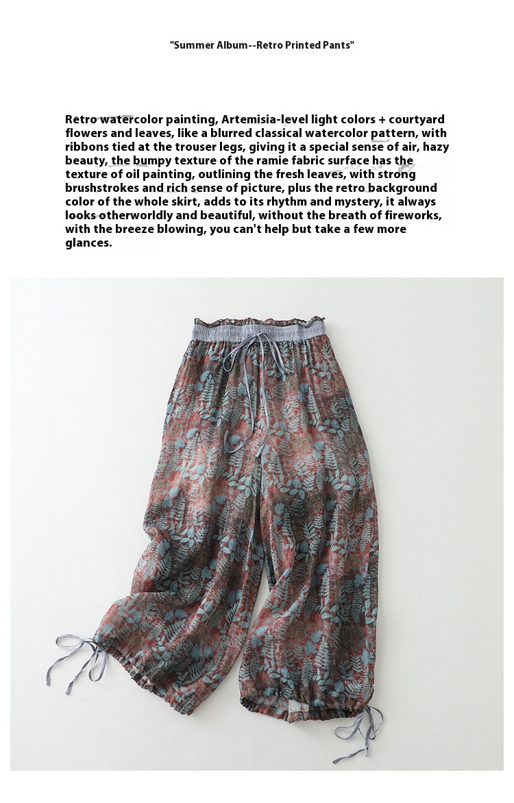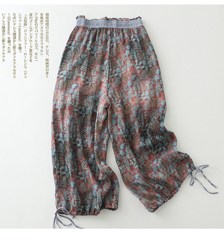 Women's Cotton Linen Retro Print Cropped Pants – Loose Fit Wide-Leg Casual Trousers
