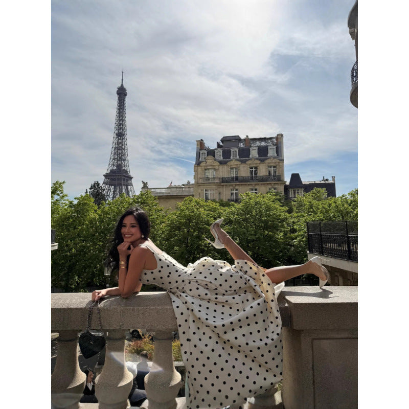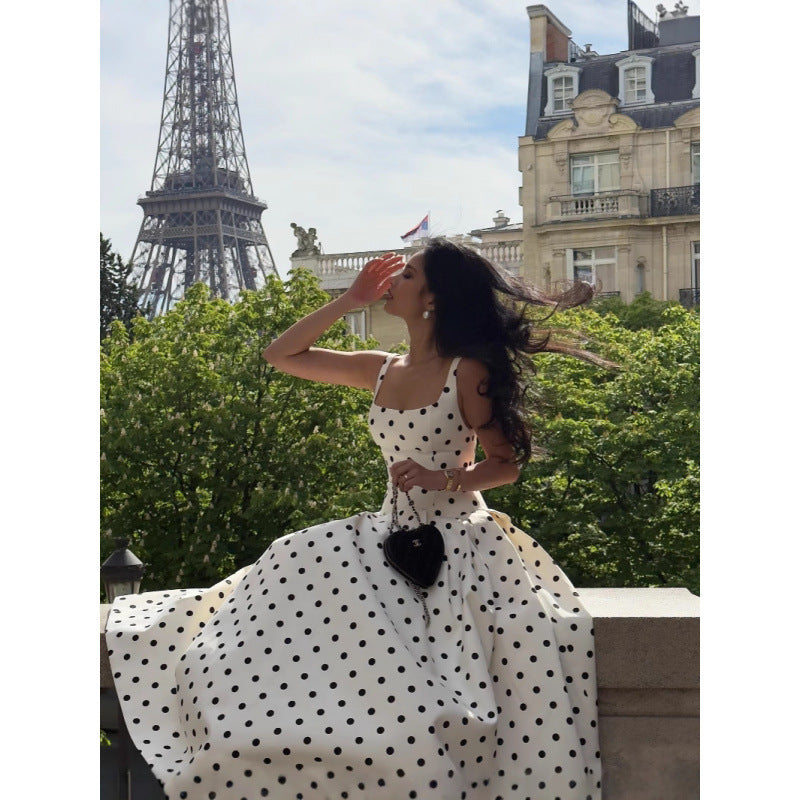 Square Collar Polka-dot Cinched Pleated Large Swing Sling Dress